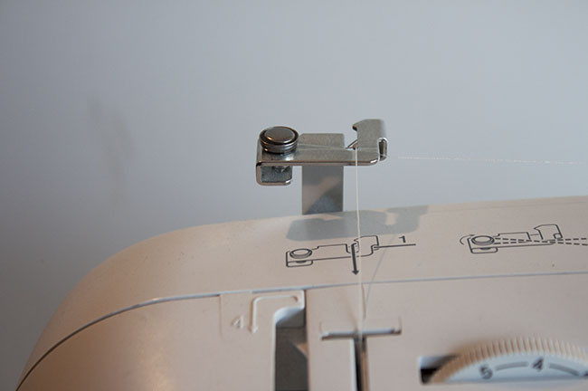 When you can take the bottom thread, take it together with top thread to the back. You’re sewing machine is threaded with both threads and is almost ready to start sewing.